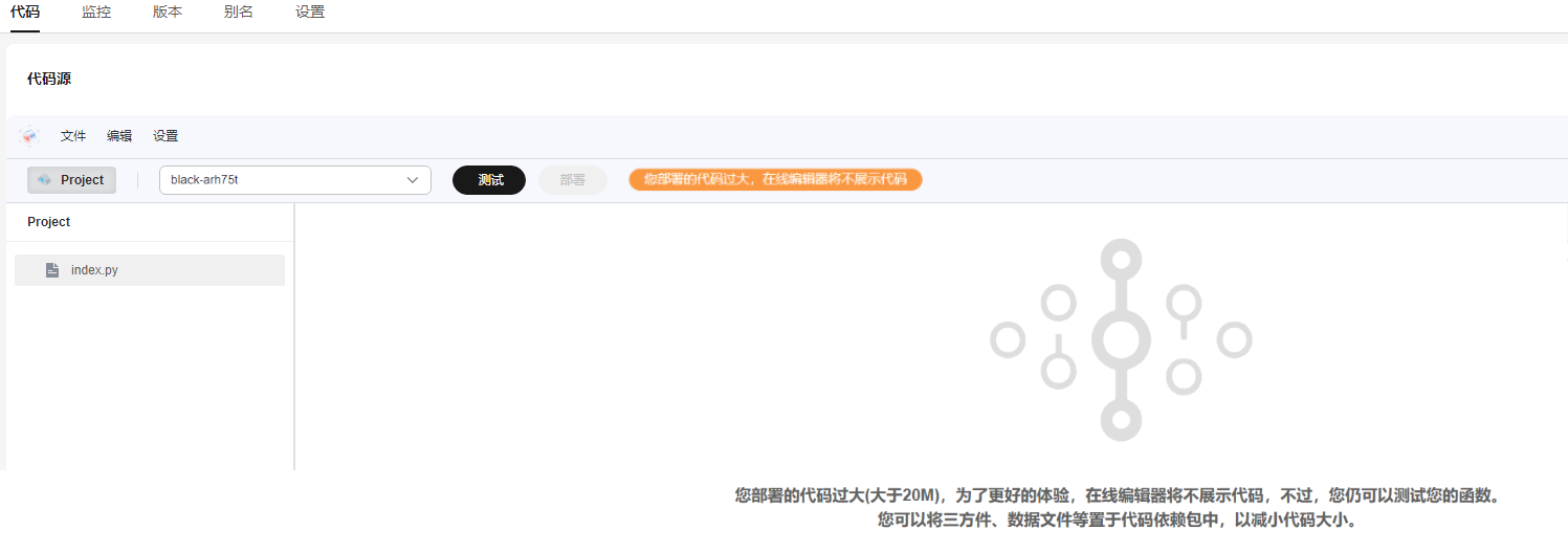 - 当代码编辑器中部署的代码大于20mb时将不展示代码,如图1所示,但仍可以正常测试函数代码。