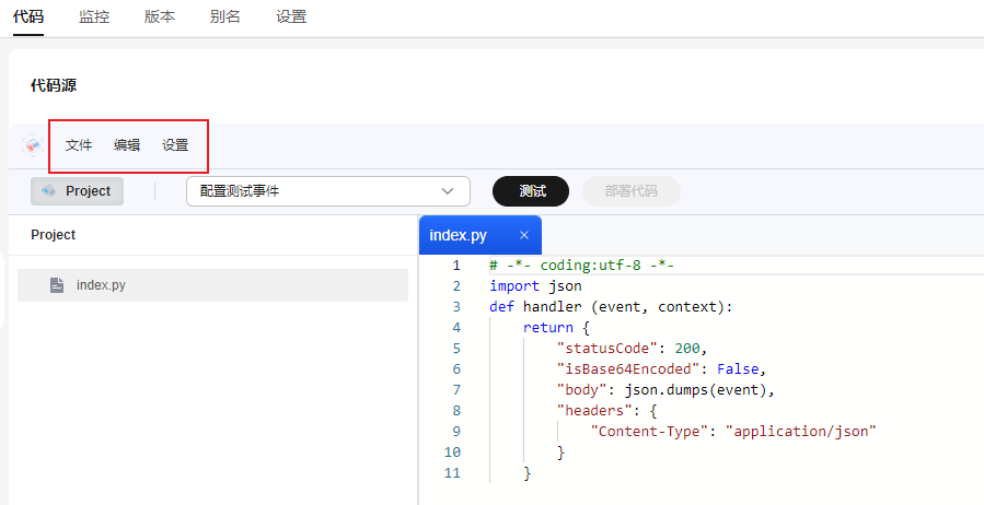 - 完成代码编辑后,单击“部署代码”,控制台会将代码及相关的配置信息压缩到functiongraph服务可运行的代码文件中,无需其他操作。