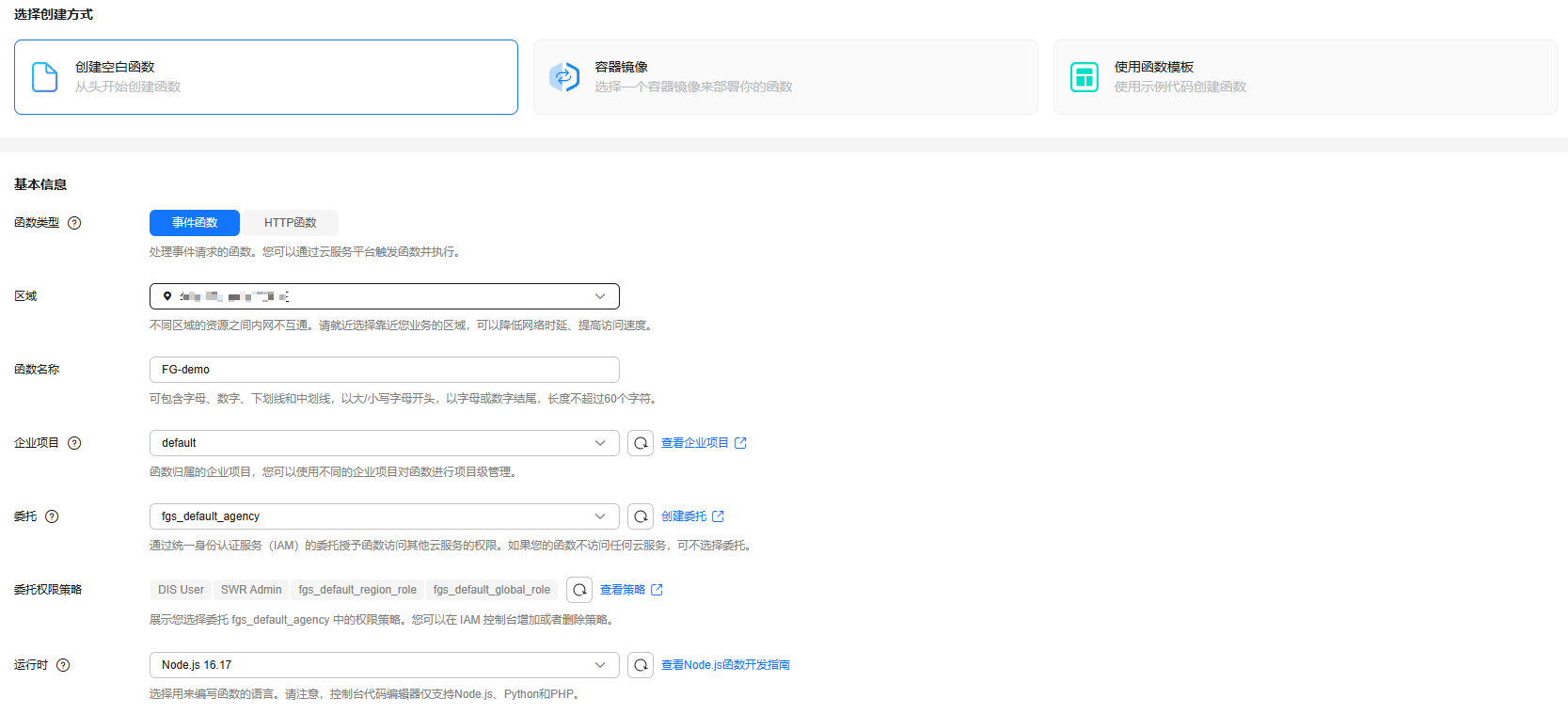 - 如图1所示,创建方式选择“创建空白函数”,参考表2配置函数基本信息,参考表3配置函数高级设置参数。