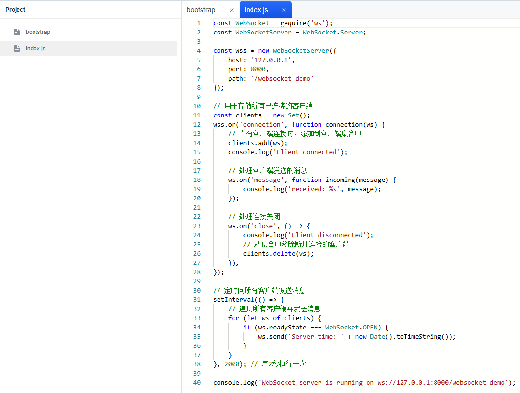 const websocket = require('ws'); const websocketserver = websocket.server; const wss = new websocketserver({ host: '127.0.0.1', port: 8000, path: '/websocket_demo' }); // 用于存储所有已连接的客户端 const clients = new set(); wss.on('connection', function connection(ws) { // 当有客户端连接时,添加到客户端集合中 clients.add(ws); console.log('client connected'); // 处理客户端发送的消息 ws.on('message', function incoming(message) { console.log('received: %s', message); }); // 处理连接关闭 ws.on('close', () => { console.log('client disconnected'); // 从集合中移除断开连接的客户端 clients.delete(ws); }); }); // 定时向所有客户端发送消息 setinterval(() => { // 遍历所有客户端并发送消息 for (let ws of clients) { if (ws.readystate === websocket.open) { ws.send('server time: ' new date().totimestring()); } } }, 2000); // 每2秒执行一次 console.log('websocket server is running on ws://127.0.0.1:8000/websocket_demo');图1 index.js文件
