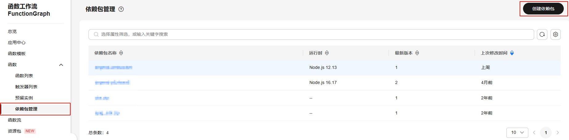 - 返回函数工作流控制台,如图3所示在左侧的导航栏选择“函数 > 依赖包管理”,单击“创建依赖包”。