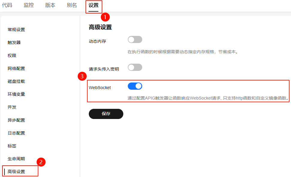 - 仅http函数支持配置websocket,事件函数不支持配置。