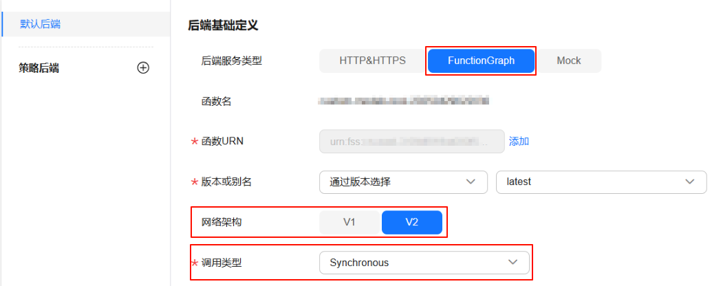 - 后端服务类型:选择“functiongraph”。