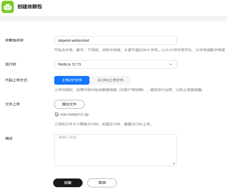 - “wss-nodejs12”文件,在“创建依赖包”界面如图4所示上传并配置websocket依赖包信息,填写完成后单击“创建”。