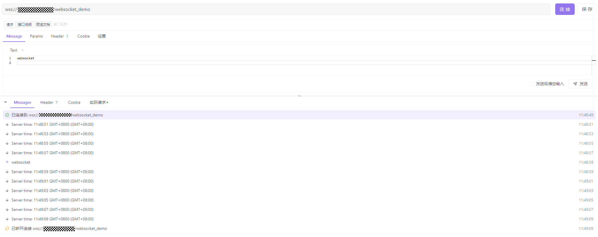 - 连接websocket,连接成功后即可发送消息,可查看消息接收情况。