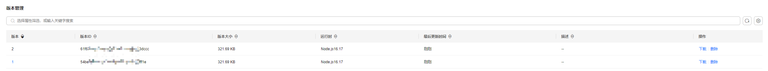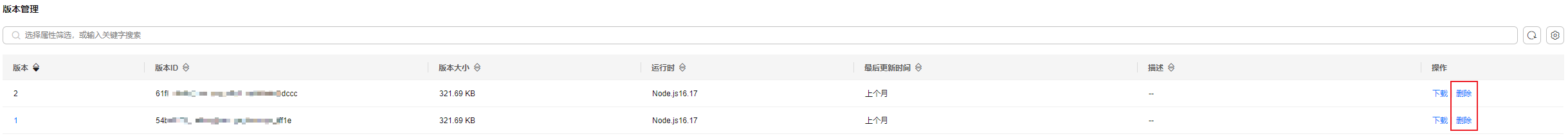 - 单击版本号所在行的“下载”和“删除”,可以下载和删除该版本。
