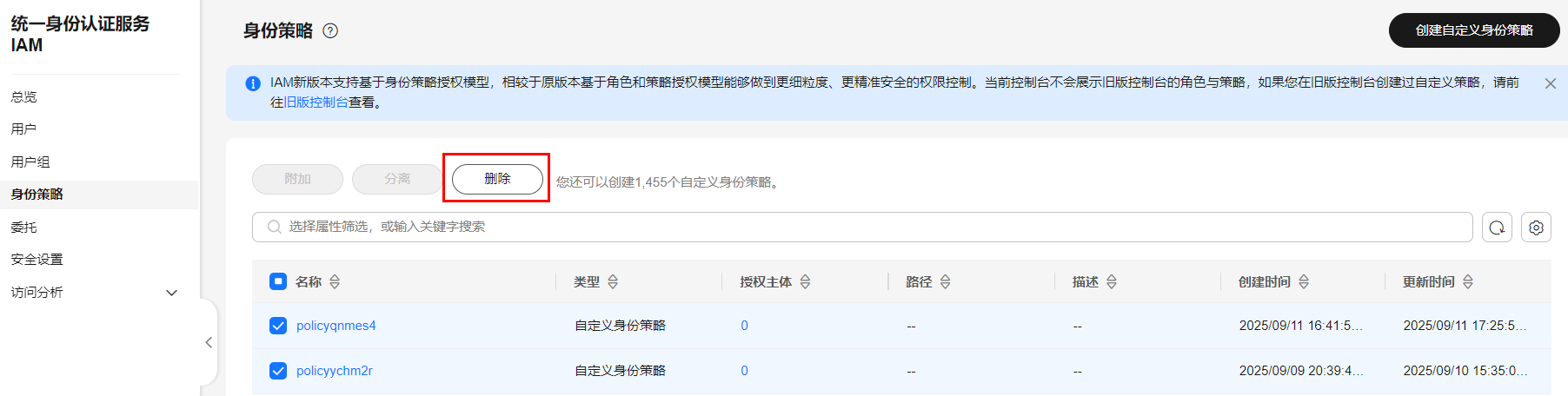 如果当前自定义身份策略已被授权给iam身份,则无法删除。移除附加给iam身份的自定义身份策略后,才可删除自定义身份策略。