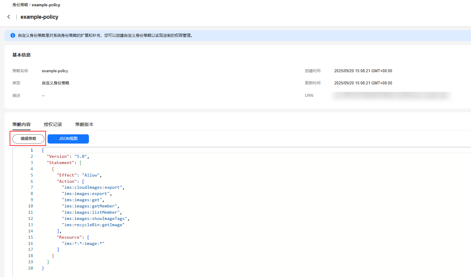 - 按可视化视图配置自定义身份策略或json视图配置自定义身份策略方式修改自定义身份策略。暂不支持修改自定义身份策略名称和身份策略描述。