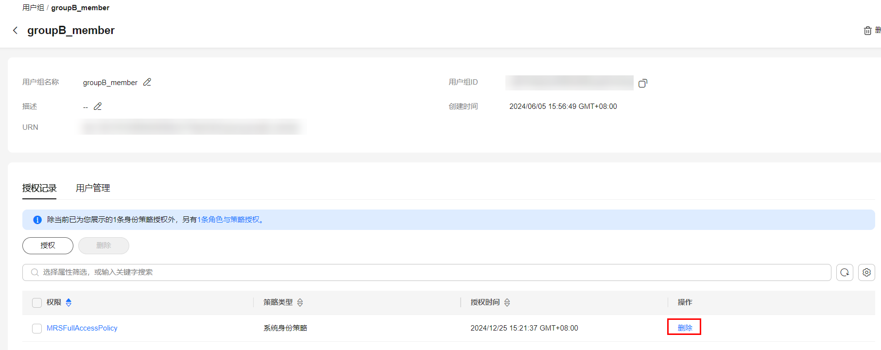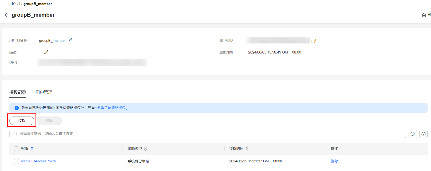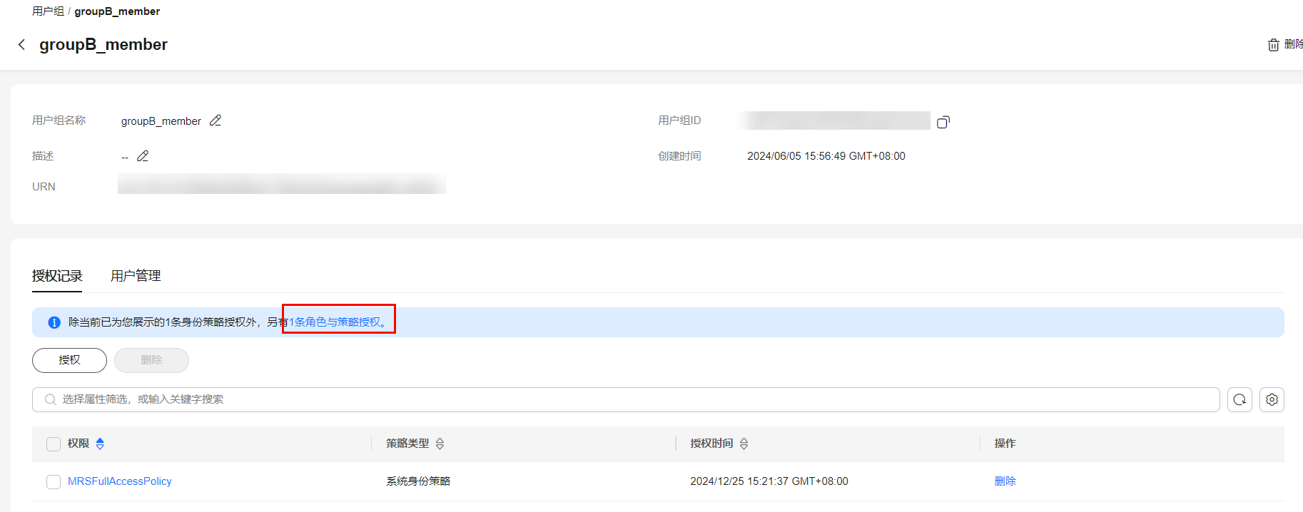 - 单击“授权记录”页签提示文字的“角色与策略授权”,可查看角色与策略授权记录。同时,您可在此处对该用户组的权限进行“授权”和“删除”操作。