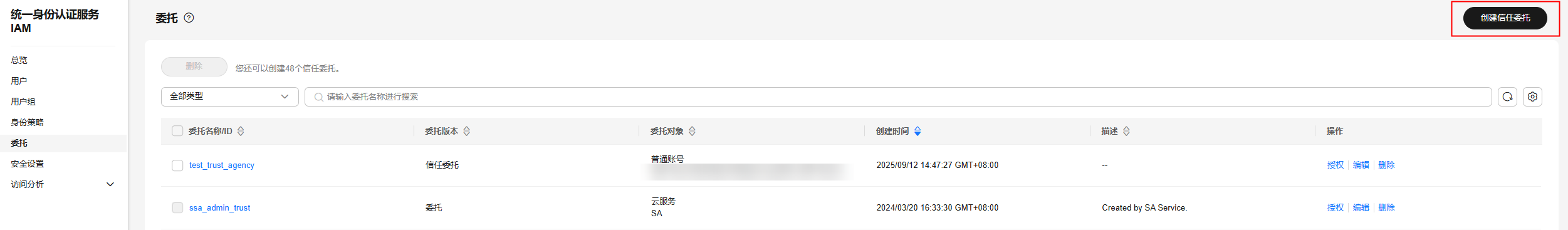 - 在统一身份认证服务的左侧导航窗格中,选择“委托”页签,单击右上方的“创建信任委托”。