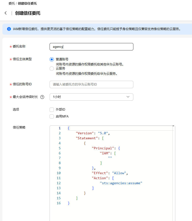 - 信任策略区域将会展示当前信任策略的内容,如需编辑请在创建后修改信任委托,请参见删除或修改委托。