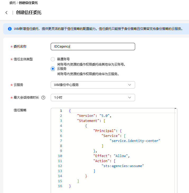- 信任策略区域将会展示当前信任策略的内容,如需编辑请在创建后修改信任委托,请参见删除或修改委托。