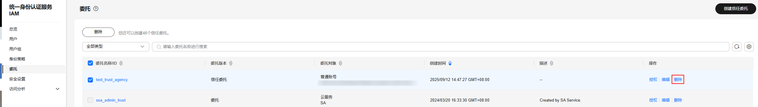 如果需要删除多个信任委托,可在委托列表中勾选需要删除的信任委托,然后单击列表上方的“删除”。委托不支持在新版控制台批量删除。