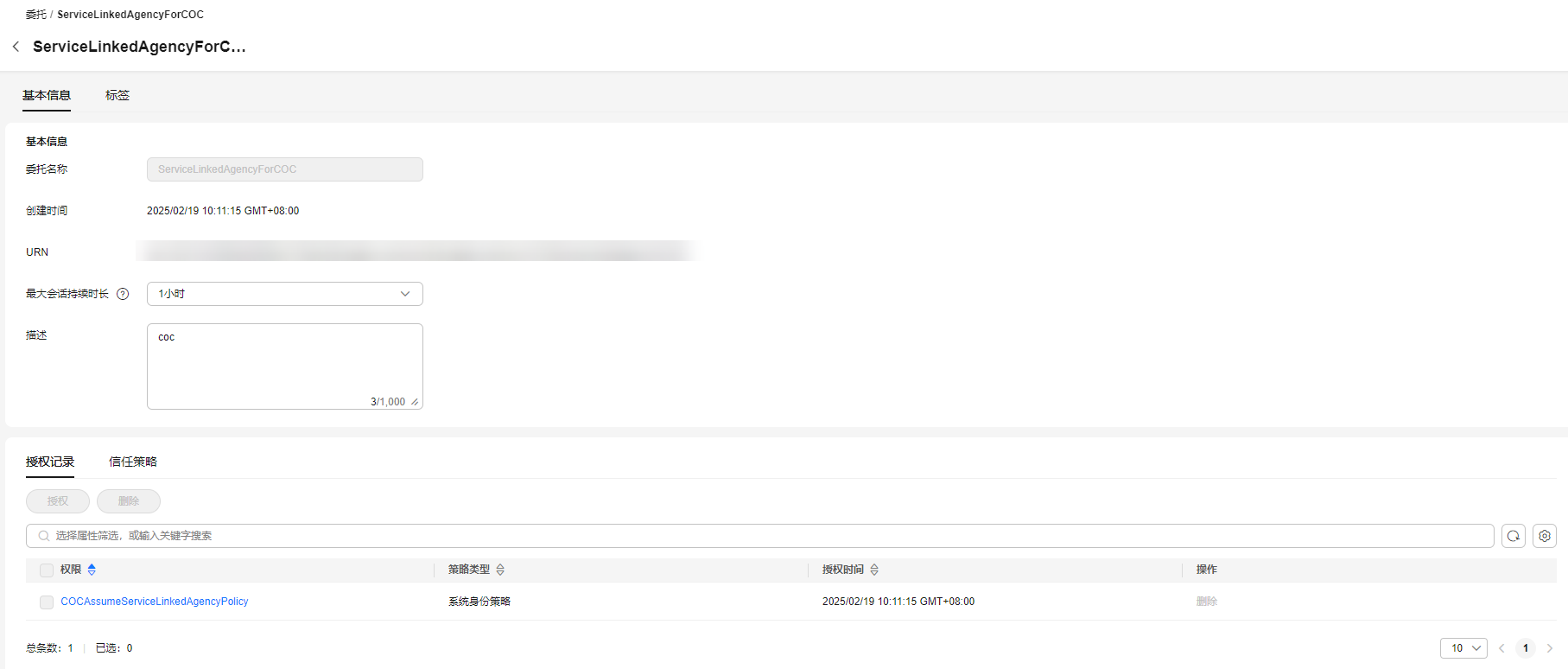 - 单击“授权记录”页签,可以查看信任委托的授权记录。同时,您可在此处对该信任委托的权限进行“授权”和“删除”操作。