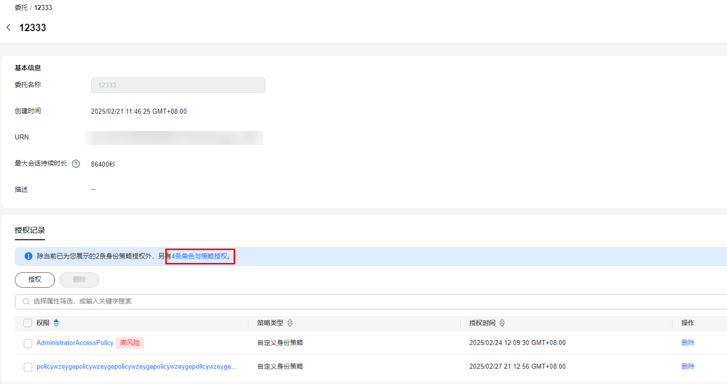 - 单击“授权记录”页签提示文字的“角色与策略授权”,可以查看委托的角色与策略授权记录。同时,您可在此处对该委托的权限进行“授权”和“删除”操作。