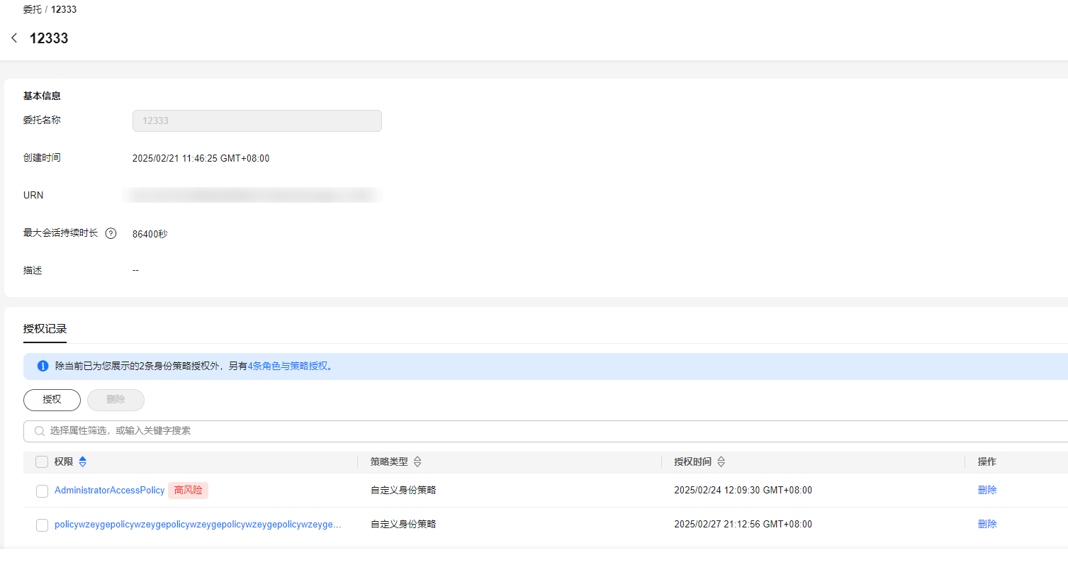 - 在“授权记录”页签,可以查看委托的身份策略授权记录。同时,您可在此处对该委托的权限进行“授权”和“删除”操作。