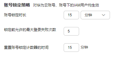 管理员可以设置账号锁定时长、锁定前允许的最大登录失败次数、重置账号锁定计数器的时间。如果在账号锁定计数器的时间内,超出了允许的最大登录失败次数,那么将对登录的账号根用户或iam用户锁定指定时长。