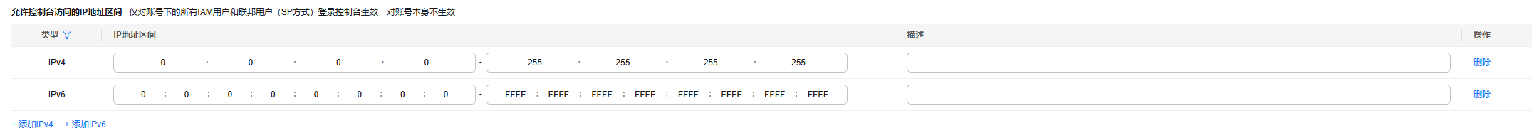 限制用户只能从设定范围内的ip地址访问华为云,ipv4地址可以在0.0.0.0-255.255.255.255之间设置,默认值为0.0.0.0-255.255.255.255。ipv6地址可以在0:0:0:0:0:0:0:0-ffff:ffff:ffff:ffff:ffff:ffff:ffff:ffff之间设置,默认值为0:0:0:0:0:0:0:0-ffff:ffff:ffff:ffff:ffff:ffff:ffff:ffff。如不设置或设置为默认值意味着您的iam用户可以从任意地方访问华为云。