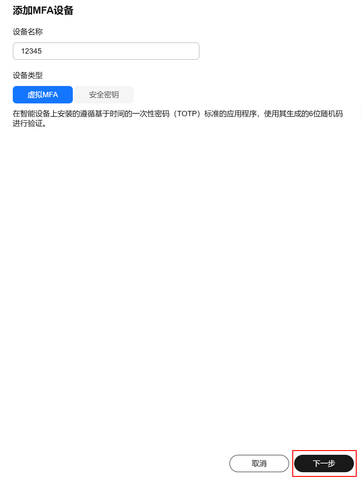 - 选择mfa设备。此处选择“虚拟mfa”,然后单击“下一步”。