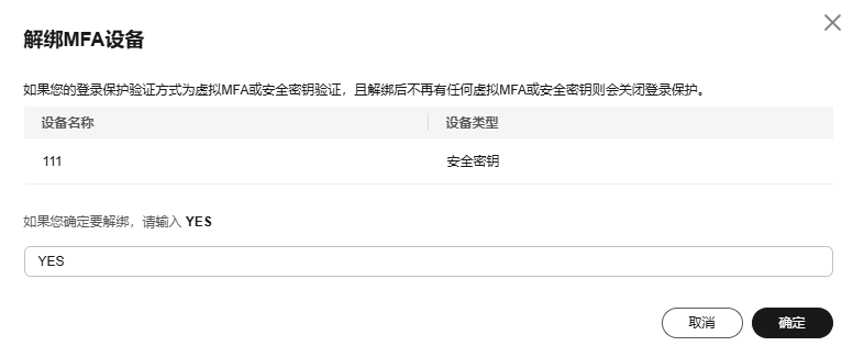 - 单击“确定”,完成解绑安全密钥。