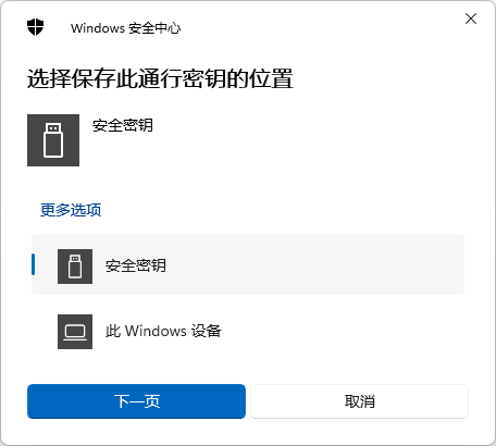 - 在新的弹窗中,选择“安全密钥”,单击“下一页”。