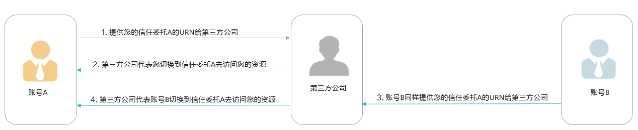 - 第三方公司使用该信任委托的urn获取临时安全凭证以访问您账号中的资源。