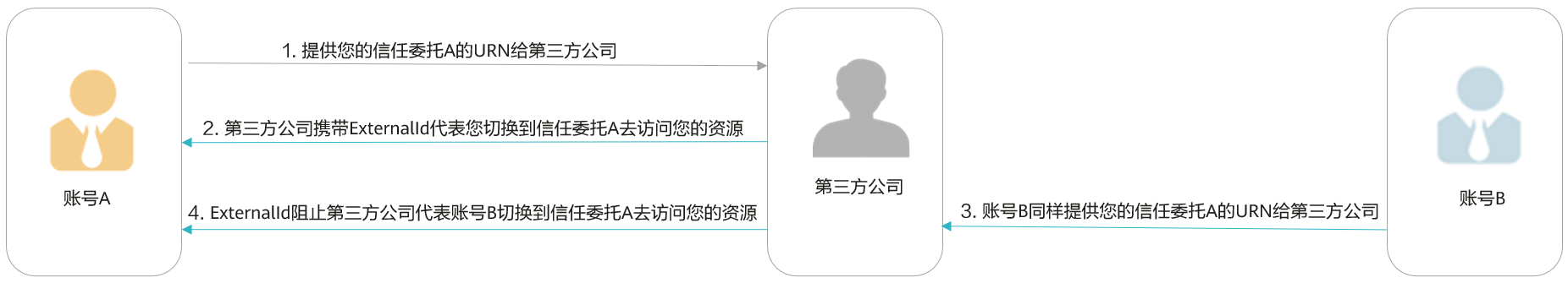- 但是这一次,当账号b要求第三方公司访问(它声称的)其账号的资源时,第三方公司会携带与账号b关联的externalid(456789)去调用assumeagency api,由于您只将您自己externalid(123456)添加到了信任策略中,而并没有将账号b的externalid(456789)添加到信任策略中,因此使用您的信任委托a的urn调用assumeagency api将会失败。