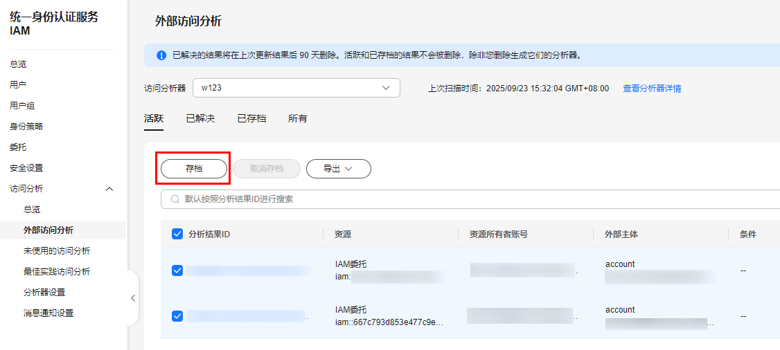 如果访问权限是预期中的,例如对于外部访问分析的结果,策略中包含的是业务流程所需要的公共访问权限,或对于未使用的访问分析结果,即使未使用该访问密钥也是必要的,则可以将分析结果进行存档。存档后,结果将会从“活跃”变成“已存档”状态,方便查阅其他“活跃”的访问分析结果。存档结果不会将结果进行删除,可以随时对结果取消存档。