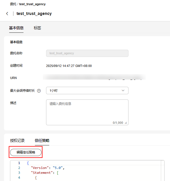 - 在信任委托基本信息下方,选择“信任策略”页签,单击“编辑信任策略”。