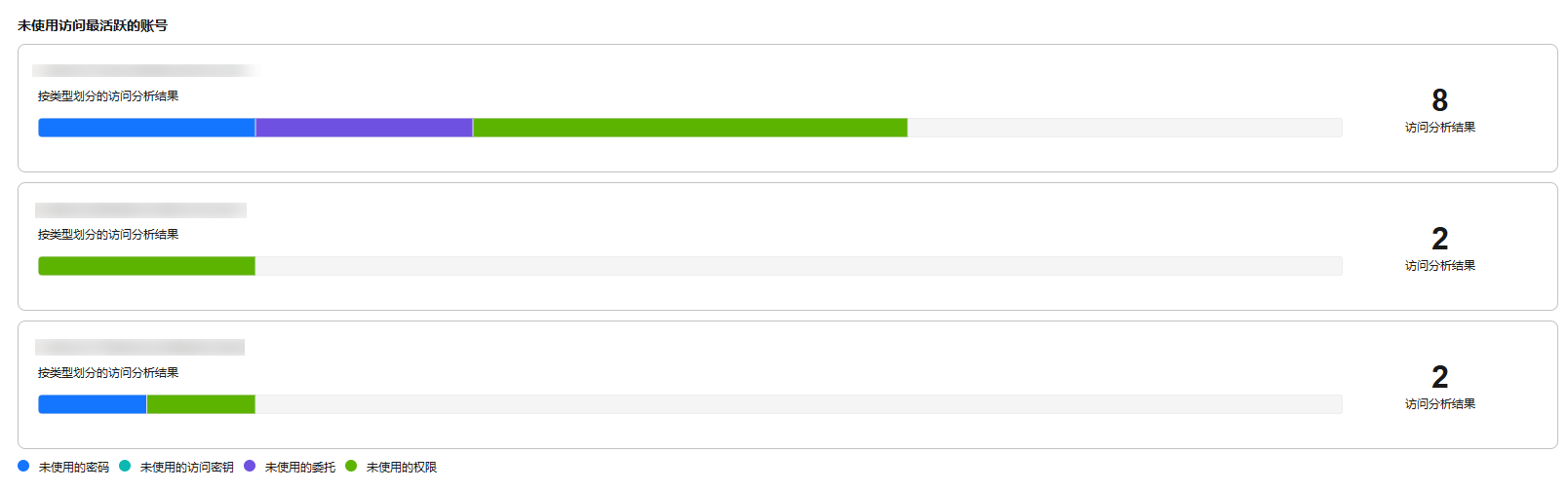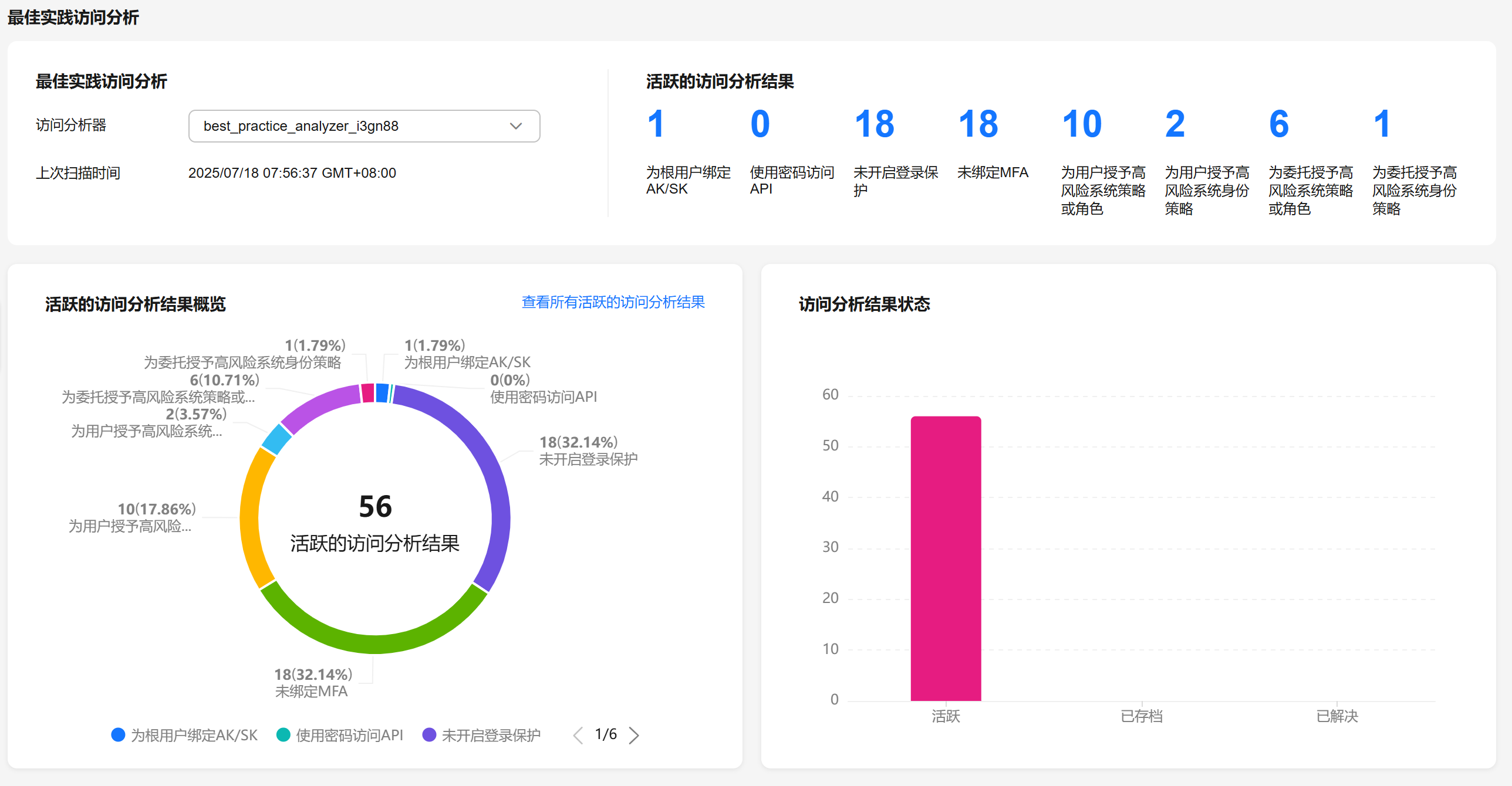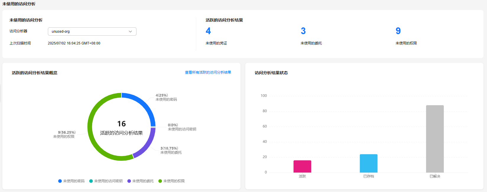 - 访问分析结果状态:包含账号或组织中的访问分析结果的状态(活跃、已存档和已解决)的明细。