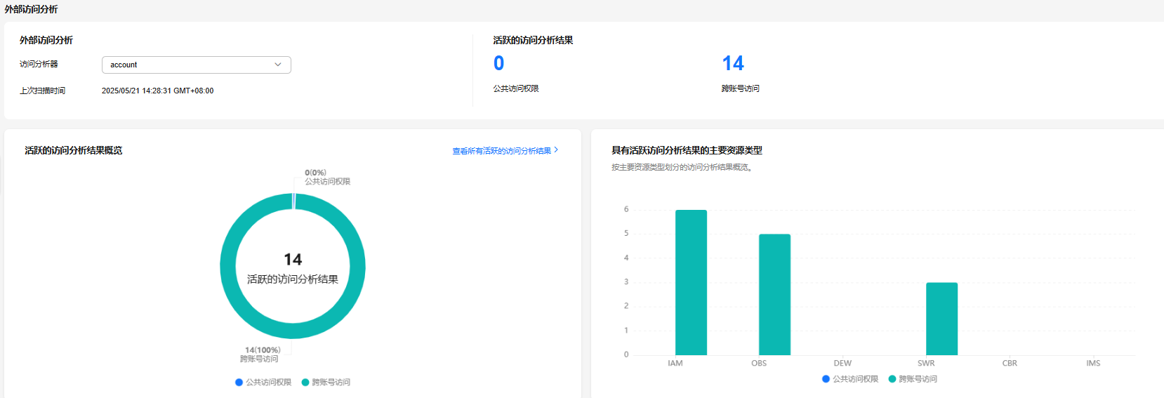 - 具有活跃访问分析结果的主要资源类型:包含具有活跃访问分析结果的每种资源类型的数量。当前包含iam、obs、dew、swr、cbr和ims六类。分析器可能存在未在该部分中列出的资源类型的活跃访问分析结果。