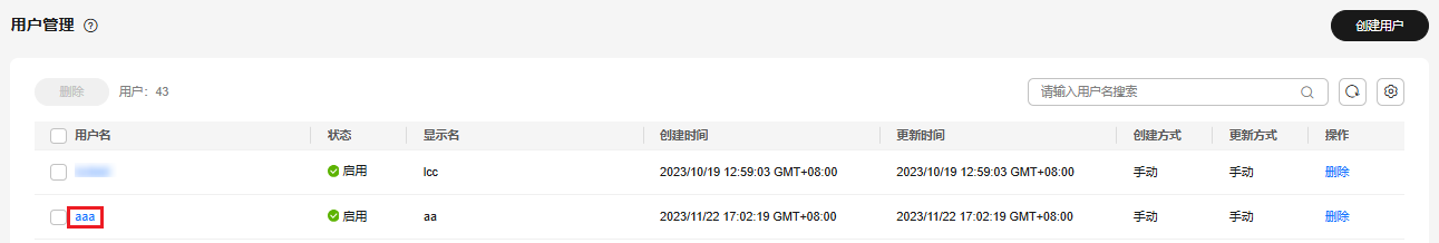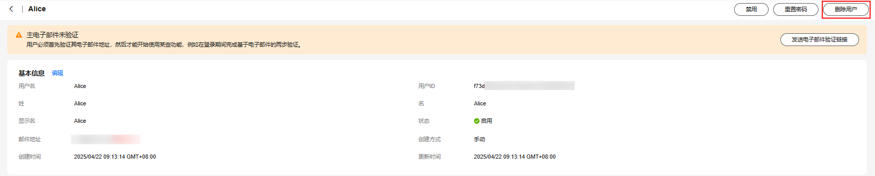 - 如需删除用户,则在用户详细信息页,单击右上角的“删除用户”。