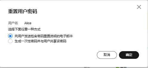 - 在弹出的确认框中选择密码的重置方式,单击“确定”,用户的密码重置完成。