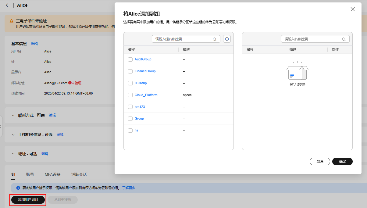 - 在用户详情页下方的“组”页签中单击“添加用户到组”。