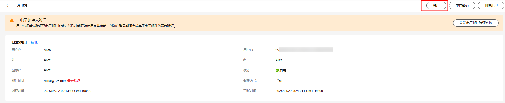 当您暂时不需要使用某个用户时,可以禁用此用户的访问权限。如需重新使用,您可以将其再次启用。