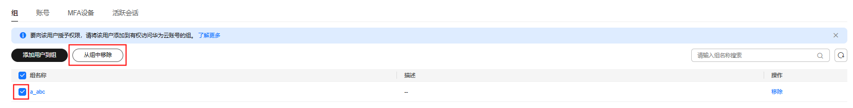 - 在用户组列表中,勾选需要退出的用户组,单击“从组中移除”。