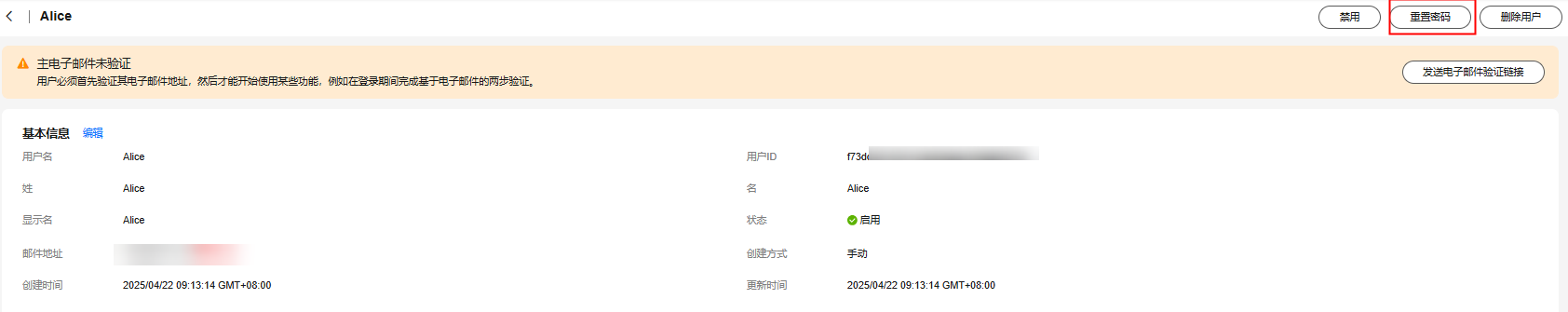 用户创建完成后,在用户详情页您可以查看用户信息,还可以进行修改用户信息、重置密码、禁用/启用/删除用户和加入/退出用户组等操作。