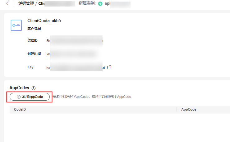 - 使用appcode简易认证(推荐):简易认证指在调用api时,http请求头部消息增加一个参数x-apig-appcode(参数值填凭据详情中“appcode”的值),而不需要对请求内容签名,api网关也仅校验appcode,不校验请求签名,从而实现快速响应。以下为操作步骤: