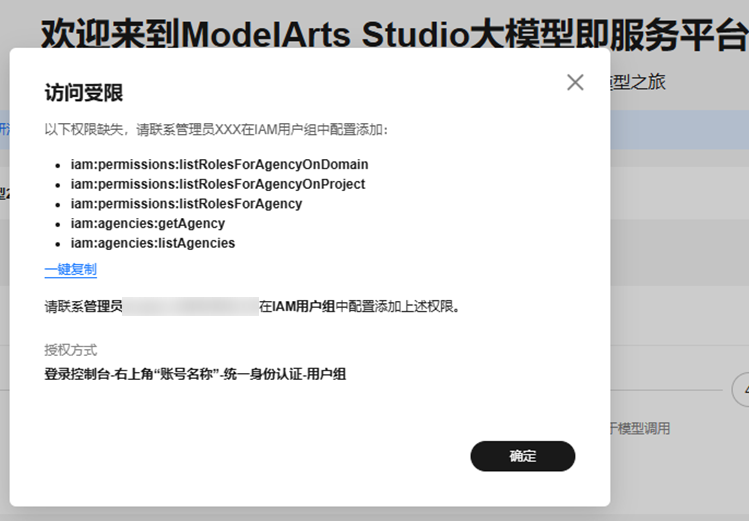 1. 子账号在“访问受限”对话框,单击“一键复制”,保存权限缺失内容,单击“确定”