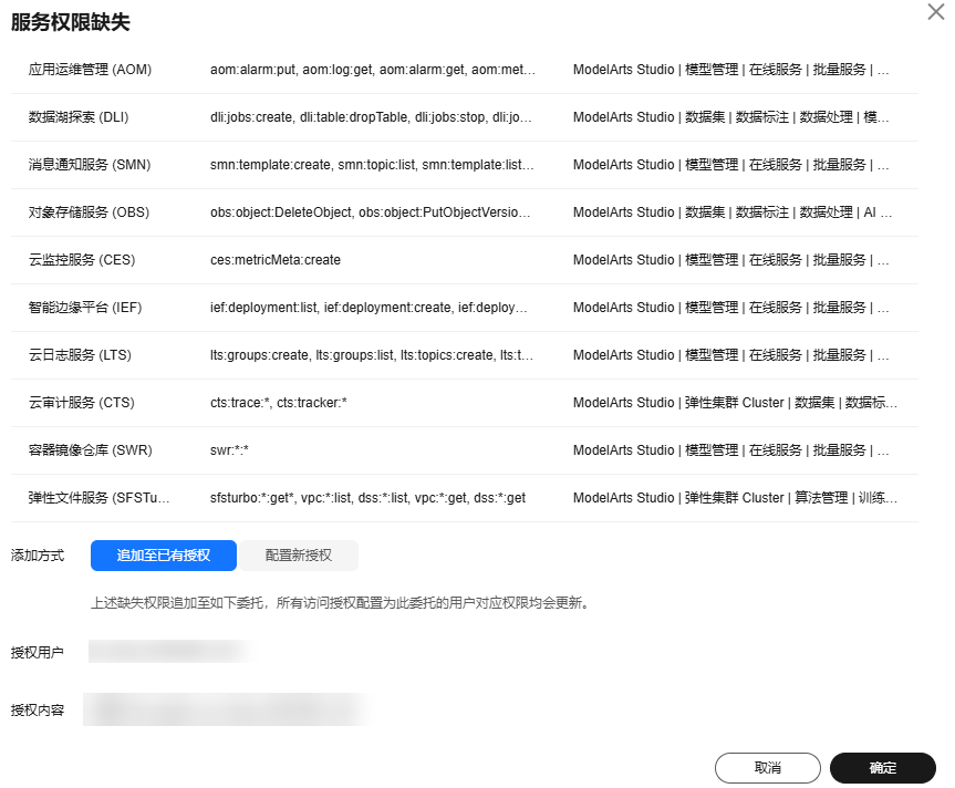 您可以在弹出的提示语中单击“此处”,在“服务权限缺失”对话框,按需选择“追加至已有权限”“配置新授权”,然后单击“确定”
