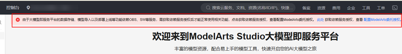 由于大模型即服务平台的数据存储、模型导入以及部署上线等功能依赖obs、swr等服务,需获取依赖服务授权后才能正常使用相关功能。