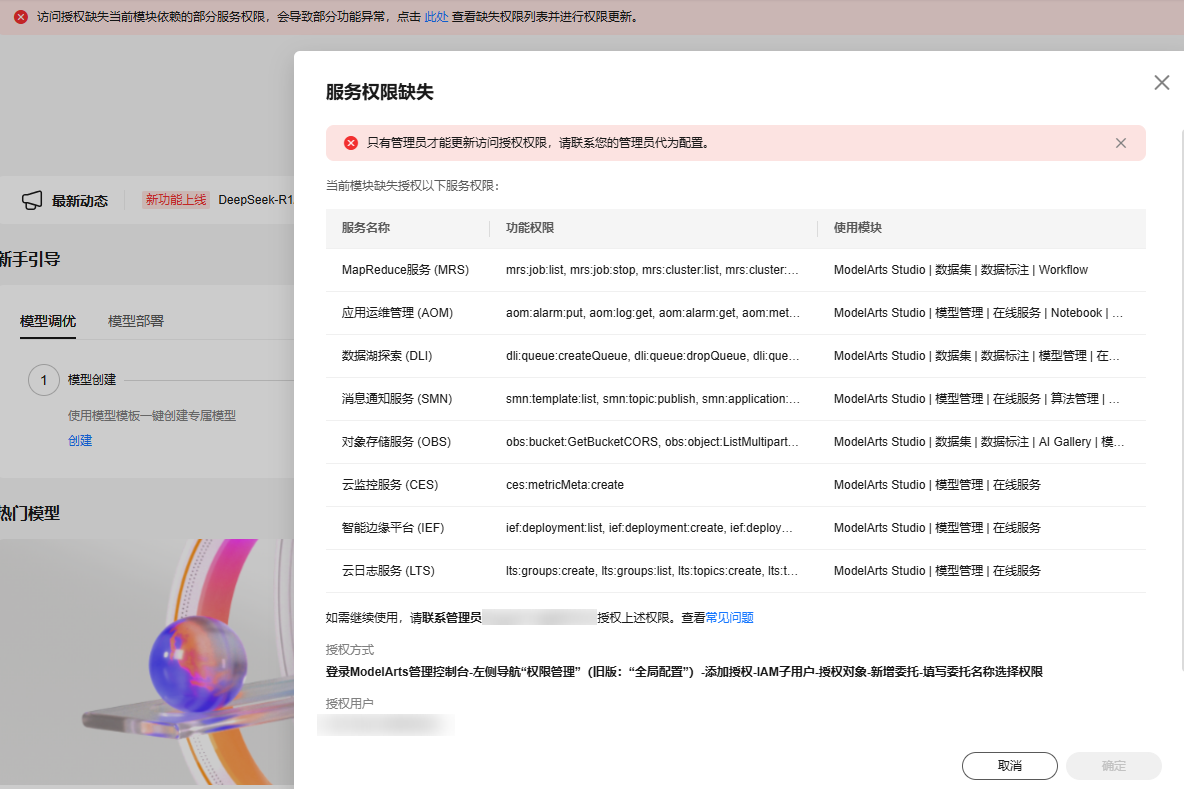 2. 联系管理员配置缺失的服务权限。具体操作,请参见配置maas委托授权