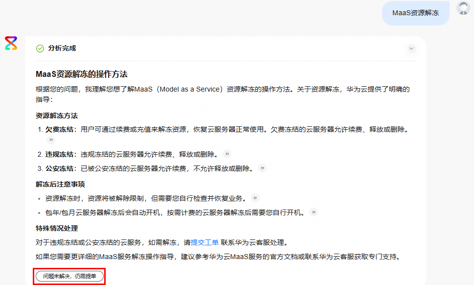 - 样式一:输入问题(如maas资源解冻)后,有以下两种情况,请按照实际情况操作。