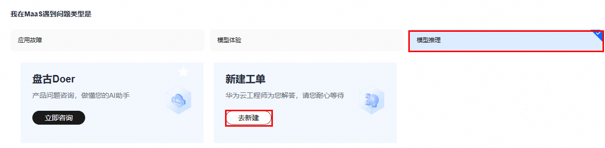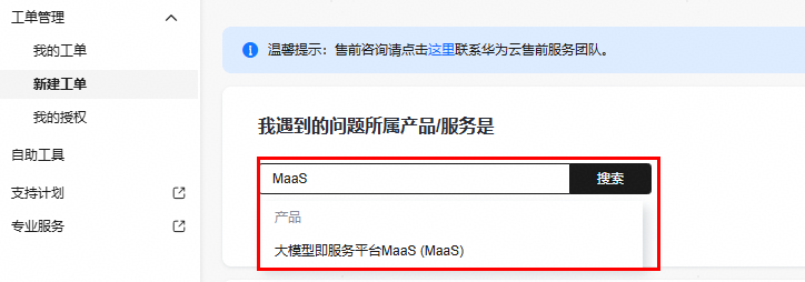 - 样式二:在搜索框输入maas,选择“大模型即服务平台maas (maas)”,问题类型选择“模型推理”,在“新建工单”卡片中单击“去新建”,填写相关信息并勾选协议,单击“提交”。