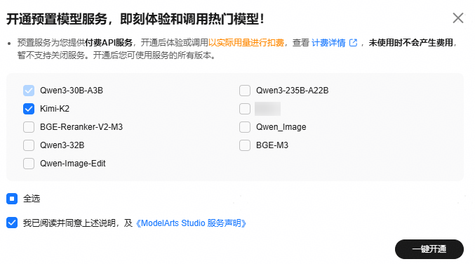- 在开通预置模型服务对话框,按需勾选预置服务,勾选“我已阅读并同意上述说明,及《modelarts studio 服务声明》”,单击“一键开通”。