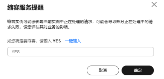 - 缩容:按需减少“变更后实例数”,单击“确定”,在“缩容服务提醒”对话框,查看提示信息,确认无误后输入yes,单击“确定”。