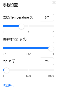 - (可选)在“文本对话”页面左上方,单击“模型参数”,按需拖动或直接输入数值配置推理参数,获得更好的模型推理效果。单击“恢复默认”可以将参数值调回默认值。