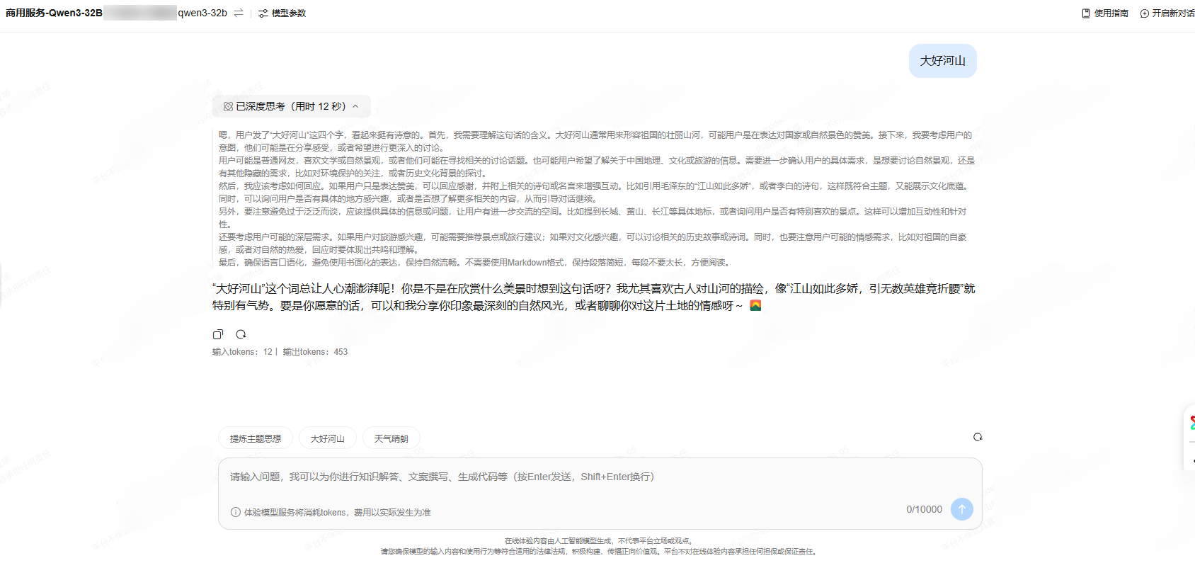 - 在对话框中输入问题或者使用控制台提供的推荐词,查看返回结果,在线体验模型服务。