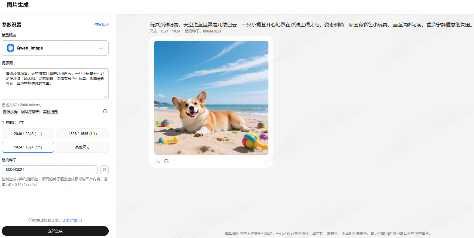 - 在“图片生成”页面的“参数设置”区域,设置相关参数,然后单击“立即生成”。