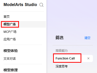 您可以登录,在“模型广场”页面的“筛选”区域,“高级能力”选择“function call”,筛选出的模型均支持function call。